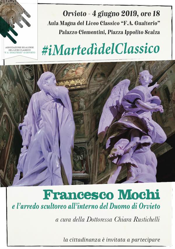 A "Francesco Mochi e l'arredo scultoreo all'interno del Duomo di Orvieto" è dedicata la Conferenza che martedì 4 giugno alle 18 chiama in cattedra nell'Aula Magna di Palazzo Clementini, sede del Liceo Classico e delle Scienze Umane, la giovane storica dell'arte Chiara Rustichelli. L'iniziativa, ad ingresso libero ed aperto alla città, rientra nel ciclo "I Martedì del Classico" promosso dall'Associazione Ex Alunni del Liceo Classico "F.A. Gualterio" di Orvieto.