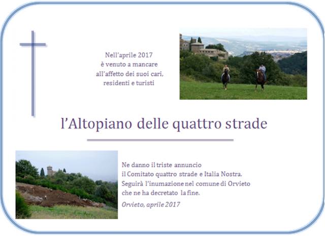 Il Comitato Quattro Strade si è impegnato con Italia Nostra per difendere e salvaguardare un'agricoltura sana e rispettosa di persone e animali, per promuovere le piccole imprese agricole biologiche locali che sono un fiore all'occhiello per l'intera comunità. Con una seconda diffida al Comune di Orvieto, Italia Nostra sostenuta dal Comitato Quattro Strade, ha chiesto al Comune di rispettare le leggi in vigore per il Parco Culturale dell'Altopiano. Le richieste, peraltro fondate sulle leggi vigenti, sono state ad ora completamente disattese dal Comune di Orvieto, nella persona del sindaco Germani e dell'assessore all'ambiente in deroga, lo stesso Germani.