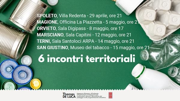 Parte il ciclo di sei incontri territoriali dedicati al percorso di partecipazione intorno al nuovo disegno di legge sull'economia circolare e all'aggiornamento del piano rifiuti. Il primo appuntamento si terrà a Spoleto, mercoledì 29 aprile alle 21 a Villa Redenta. L'obiettivo degli incontri, promossi dalla presidente Stefania Proietti e dall'assessore regionale all'Ambiente Thomas De Luca, è coinvolgere cittadini, amministratori e stakeholder per raccogliere proposte e criticità sulla nuova legge "Umbria Circolare" che si pone come obiettivo quello di trasformare la gestione dei rifiuti da problema a risorsa capace di generare valore economico e sociale. Superare quindi la logica dell'emergenza attraverso la sostenibilità e l'innovazione tecnologica.