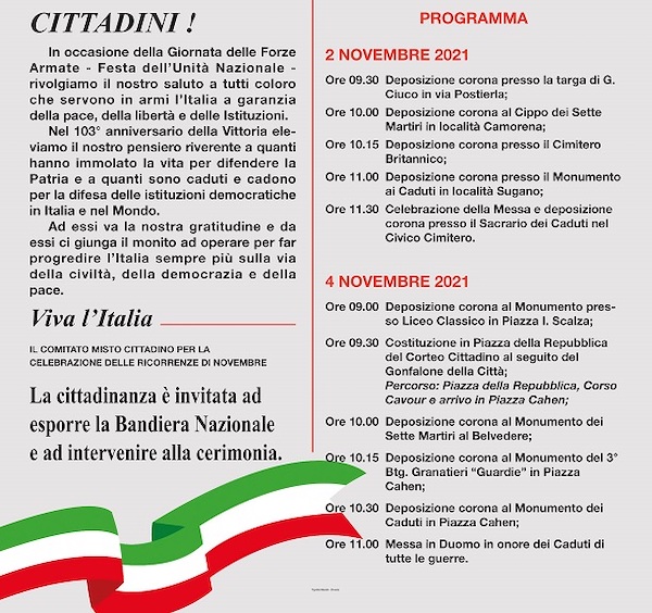 In occasione della Giornata delle Forze Armate - Festa dell’Unità Nazionale e della Commemorazione dei Defunti, il Comitato Misto Cittadino per la Celebrazione delle Ricorrenze di Novembre rivolge il “saluto a tutti coloro che servono in armi l’Italia a garanzia della pace, della libertà e delle Istituzioni. Nel 103° anniversario della Vittoria eleviamo il nostro pensiero riverente a quanti hanno immolato la vita per difendere la Patria e a quanti sono caduti e cadono per la difesa delle istituzioni democratiche in Italia e nel Mondo. Ad essi va la nostra gratitudine e da essi ci giunga il monito ad operare per far progredire l’Italia sempre più sulla via della civiltà, della democrazia e della pace. Viva l’Italia”.