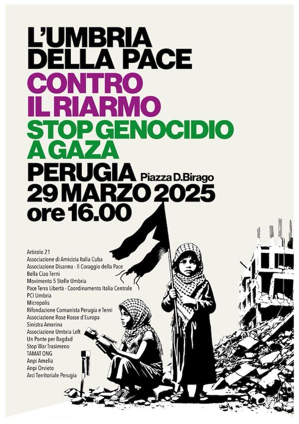 Sabato 29 marzo, alle 16, a Perugia, si terrà in Piazza Birago una manifestazione regionale dal titolo "L’Umbria della pace – Contro il riarmo – Stop genocidio a Gaza". L’iniziativa, presentata mercoledì 26 marzo all Provincia di Perugia, ha già raccolto l’adesione di circa trenta associazioni.