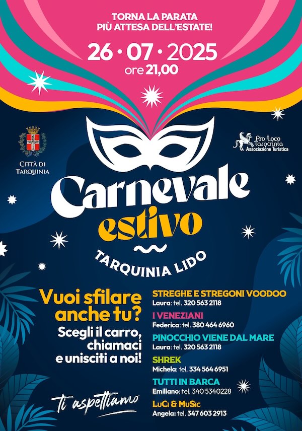 Il Carnevale Estivo rappresenta un gradito ritorno, dopo anni di assenza, nasce grazie all’impegno e alla proficua collaborazione tra gli imprenditori balneari, i commercianti del Lido, e con il sostegno convinto del Comune e della Pro Loco Tarquinia e si inserisce nel più ampio calendario degli eventi estivi promossi dall'Amministrazione Comunale per offrire a cittadini e visitatori "un'insolita esperienza di aggregazione, condivisione e valorizzazione della creatività artistica locale e nazionale, festosa come sa essere il Carnevale, anche in piena estate".