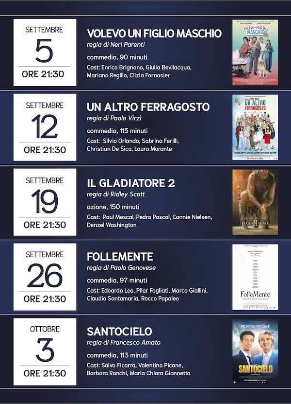Le proiezioni proseguiranno venerdì 12 settembre alle 21.30 con il film "Un altro Ferragosto" di Paolo Virzì e ancora venerdì 19 settembre alle 21.30 con "Il Gladiatore 2" di Ridley Scott, venerdì 26 settembre alle 21.30 con "Follemente" di Paolo Genovese e venerdì 3 ottobre alle 21.30 con "Santocielo" di Francesco Amato promettendo ogni volta un'esperienza di benessere e cultura, immersi nelle acque termali e sotto le stelle, in uno dei luoghi più iconici della Tuscia. "Cinema&Terme" è un progetto a cura di Est Film Festival e Terme dei Papi che punta a promuovere il territorio attraverso nuove forme di fruizione culturale, mettendo in rete le eccellenze del territorio, tra cinema, musica, turismo e benessere.
