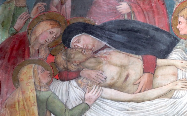 Per questo l’artista Ugolino di Prete Ilario, coadiuvato dai teologi domenicani, non esitò a raffigurarlo proprio dietro l’altare della cappella, nella scena della Deposizione. Qui, accanto a Maria ripiegata sul volto del figlio, si trovano le donne, l’apostolo Giovanni e Nicodemo che si stringono attorno al corpo senza vita di Gesù, disteso sopra il sudario; una delle donne porta con sé un vaso contenente oli profumati per ungere, secondo l’usanza dei Giudei, il Signore prima della sepoltura. Sulla destra invece, davanti alla Maddalena che sta baciando i piedi del Salvatore, appare Giuseppe d’Arimatea ,mentre stringe tra le mani il suo prezioso vaso ancora aperto. Lo sguardo è rivolto ai due personaggi che stanno per chiudere il sepolcro.