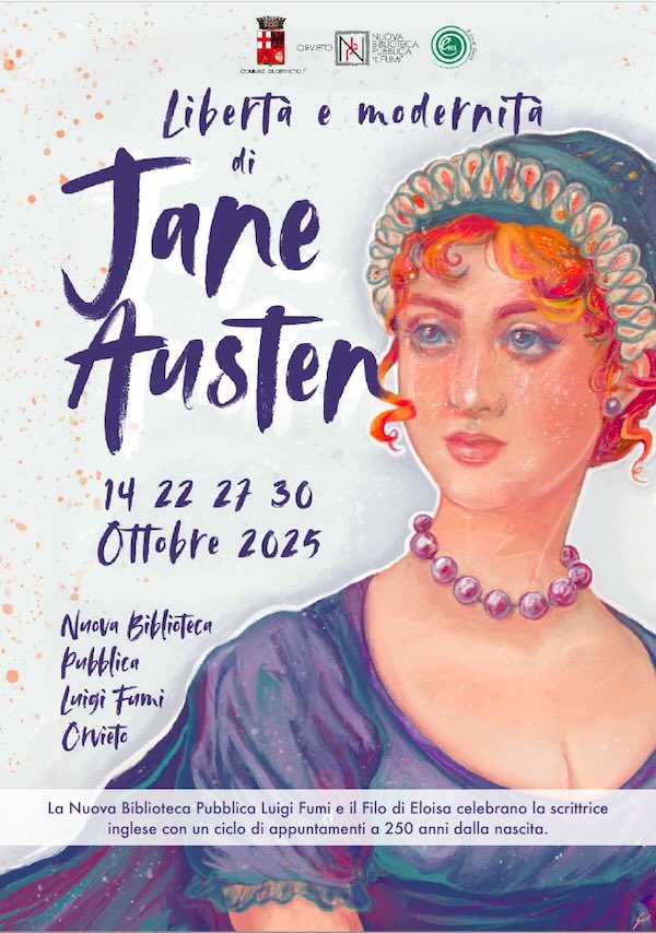A 250 anni dalla nascita di Jane Austen, la Nuova Biblioteca Pubblica "Luigi Fumi" e l'Associazione Culturale "Il Filo di Eloisa" celebrano l'intramontabile scrittrice inglese con un ciclo di appuntamenti dedicati alle sue opere più celebri, alla sua eredità letteraria e all’attualità dei suoi temi chiave nella cultura contemporanea. La collaborazione trova il suo fondamento nella presenza, in Biblioteca, della Sezione "Eloisa Manciati - Femminismi Genere Differenza", che raccoglie opere di tante scrittrici e pensatrici delle letterature europee, tra cui la stessa J. A. Il ciclo, che si protrarrà per tutto il mese di ottobre, ha come titolo "Libertà e modernità di Jane Austen" ed è volto non solo a fornire una chiave attuale per comprendere il successo ininterrotto di questo particolare classico da oltre due secoli, ma anche a interrogarsi su come viene recepito e riletto nella contemporaneità.