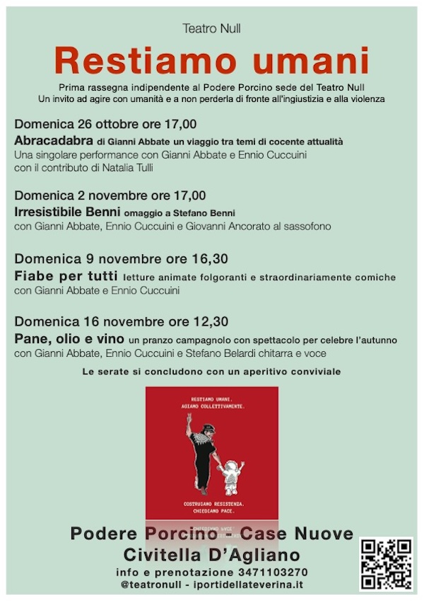 Parte domenica 26 ottobre con Abracadabra la rassegna indipendente "Restiamo umani" organizzata dal Teatro Null nella sede in campagna Podere Porcino, Case Nuove, Civitella d'Agliano. "Con questa rassegna - dice il suo ideatore, Gianni Abbate - vogliamo invitare tutti ad agire con umanità e a non perderla di fronte all'ingiustizia e alle violenze che riscontriamo tutti i giorni ormai da tempo.