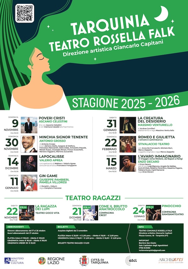 "Il sipario si alza di nuovo a Tarquinia, e con esso si riaccende il desiderio di incontro, di racconto, di emozione condivisa. ATCL, in collaborazione con il Comune di Tarquinia e con il sostegno della Regione Lazio e del Ministero della Cultura, presenta una nuova stagione teatrale pensata per parlare al cuore della comunità. Un viaggio tra linguaggi e visioni, che intreccia grandi nomi, nuove voci e storie capaci di riflettere il nostro tempo, tra ironia, poesia e pensiero. Il teatro comunale torna così a essere luogo vivo, aperto, dove riconoscersi e lasciarsi sorprendere. Con questa proposta, ATCL rinnova il proprio impegno a portare il teatro ovunque ci sia ascolto, curiosità e voglia di immaginare insieme". le parole dell’amministratore delegato di ATCL, Luca Fornari, e della direttrice artistica di ATCL, Isabella Di Cola.