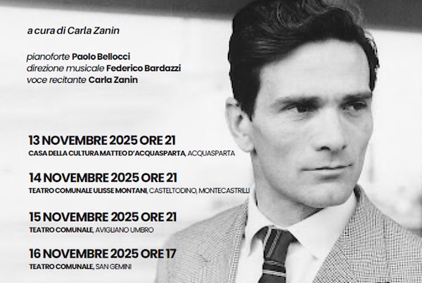 Un recital con parole, musica e video per celebrare Pier Paolo Pasolini. Lo propone "Umbria Cantat" che da giovedì 13 a domenica 16 novembre porterà lo spettacolo “Pasolini: parole, suoni, visioni” nei teatri di Acquasparta, Castel Todino (Montecastrilli), Avigliano Umbro e San Gemini. La rappresentazione sarà preceduta da workshop ambientali in collaborazione con il Laboratorio del Paesaggio di Avigliano Umbro e il Centro Turistico Giovanile Acquasparta e una Vr Experience interattiva a cura di Carla Zanin, per la direzione musicale di Federico Bardazzi, Live music Paolo Bellocci, voce recitante la stessa Zanin, visual art David Tozzi service audio video Musical Sound.