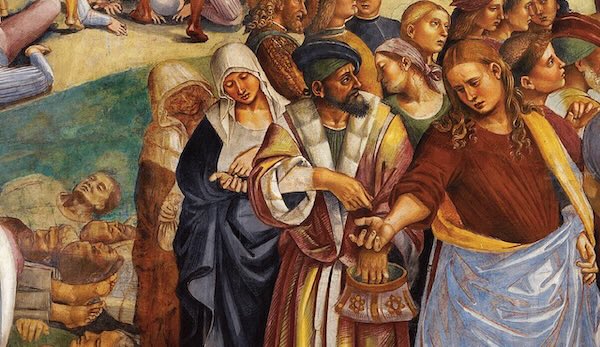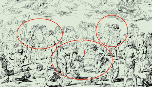 In questa corsa alle ricchezze, irrompevano le immagini dell’Apocalisse di Orvieto che, con il suo perentorio monito sull’imminente fine del mondo, richiamava tutti ad una conversione della morale e dei costumi che non esitavano a degradare nella corruzione e nell’ostentazione del lusso e della vanità. La necessità di un rinnovamento della società si faceva sempre più urgente, al punto che intellettuali e teologi umanisti elaborarono una dottrina sociale, di grande respiro, in difesa del valore della dignità umana. Nella solidarietà mostrata dai risorti c’è tutta l’eredità spirituale della Chiesa di Roma sull’importanza delle opere di misericordia corporali che, durante il Medioevo, avevano assunto la forma di vere e proprie attività sociali. Non poteva essere altrimenti per un mondo che si sforzava d’ispirarsi, quanto più possibile, ai principi del Vangelo e della morale cristiana, gettando le basi per la nascita dell’Umanesimo cristiano. Era il momento in cui l’arte rinascimentale giocava un ruolo fondamentale nella storia culturale, sociale e politica di tutta Europa, ovvero quello di unirsi alla missione profetica del pensiero filosofico e teologico del tempo, il cui unico scopo era quello di far comprendere fino in fondo la verità di tutte le cose: una pia filosofia o dotta religione che doveva accompagnare il cambiamento del mondo, piuttosto che opporsi ad esso!