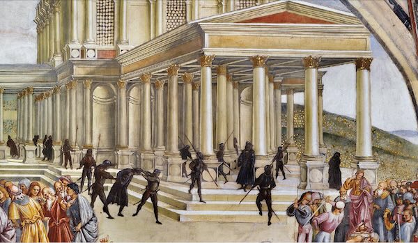 È noto che l’Apocalisse di Signorelli nel Duomo di Orvieto era anche la pubblica denuncia della crisi sociale e politica dell’Europa del ‘500, segnata da discordie cittadine e dall’ossessiva scalata al potere. Il suo messaggio andava ben oltre i limiti del tempo e dello spazio. Nella scena dell’Anticristo, il falso messia è infatti l’antitesi del bene comune, è l’immagine di un arrogante despota che ritto sul podio accumula ricchezze, ostentando tutta la sua brama di potere da mantenere ad ogni costo. Un potere economico e politico che nel ‘500 non risparmiò nemmeno la Chiesa di Roma, di papa Alessandro VI e del figlio Cesare Borgia detto il “Valentino”, comandate dell’esercito del padre nonché governatore generale di Orvieto, raffigurato da Signorelli tra la folla dell’Anticristo.