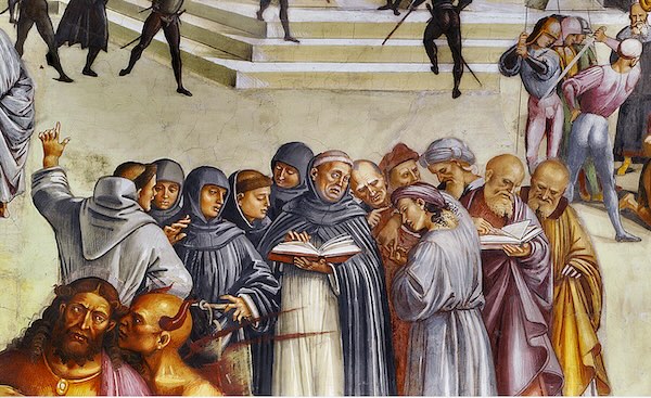 Non così è il mondo dell’Anticristo, la città degli uomini fondata sulla ’hybris’. Qui a prevalere è la parte irrazionale dell’anima, quella ‘irascibile’ della violenza e quella ‘concupiscibile’ degli irrefrenabili istinti. Al centro della scena, nel pieno del caos apocalittico degli ultimi tempi, Signorelli raffigura un piccolo gruppo di uomini che uniti da vincoli di fratellanza anelano alla “salute dell’anima”. L’artista li ritrae in disparte, quasi incuranti del caos che li circonda, e tutto ciò a significare la via da seguire.