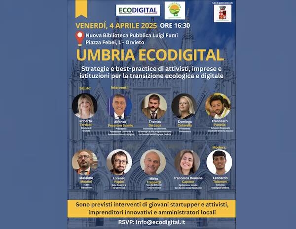 Innovazione, digitale e ambiente si incontrano a Orvieto per una giornata di confronto e ispirazione in programma venerdì 4 aprile, alle 16.30, alla Nuova Biblioteca Pubblica "Luigi Fumi". È qui che avrà luogo "Umbria Ecodigital", evento promosso dal gruppo Eco Digital Umbria, in collaborazione con Terranostra – Associazione nazionale ambientalista di Coldiretti, con il patrocinio del Comune di Orvieto.