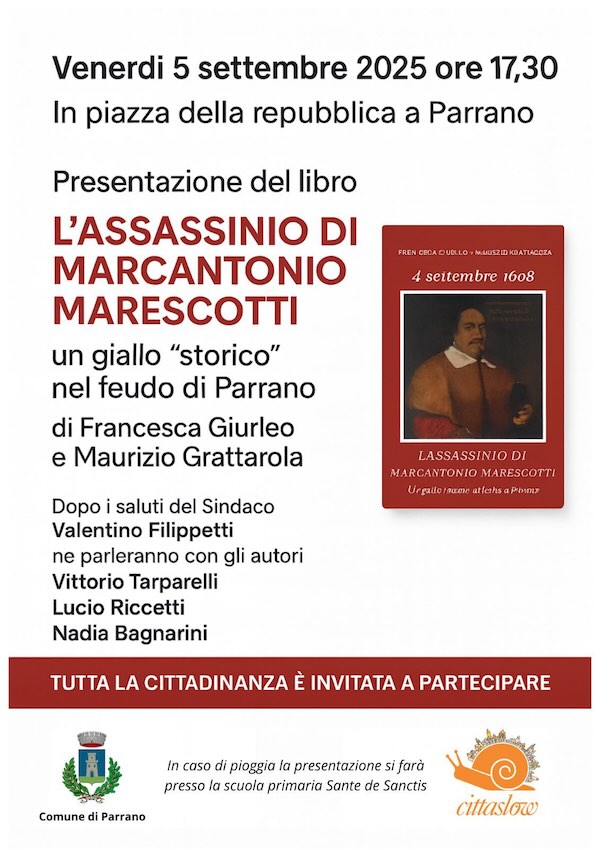 È tutto ben ricostruito, a più di quattrocento anni dai quei tragici avvenimenti, nelle 186 pagine del libro "4 Settembre 1068. L'assassinio di Marcantonio Marescotti. Un 'giallo' storico nel feudo di Parrano", fresco di stampa per Libritalia.net, che esplora sia le cause che le possibili connivenze che videro vari personaggi illustri coinvolti in una vicenda dai contorni ancora oggi non del tutto chiariti. Il volume sarà presentato venerdì 5 settembre alle 17.30 a Parrano, in Piazza della Repubblica, dagli autori Francesca Giurleo e Maurizio Grattarola.