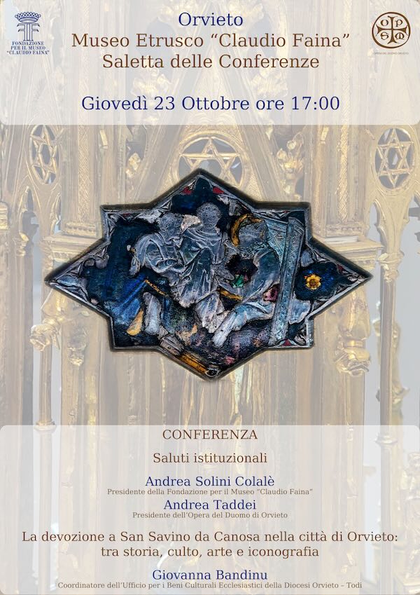 "La devozione a San Savino da Canosa nella città di Orvieto: tra storia, culto, arte e iconografia". È il titolo della conferenza pubblica organizzata dalla Fondazione per il Museo "Claudio Faina" in collaborazione con l’Opera del Duomo di Orvieto in programma per giovedì 23 ottobre alle 17 nella Saletta delle Conferenze del Museo Etrusco "Claudio Faina". Ai saluti istituzionali dell’avvocato Andrea Solini Colalè, presidente della Fondazione per il Museo "Claudio Faina", e dell’ingegnere Andrea Taddei, presidente dell’Opera del Duomo, seguirà l’intervento della dottoressa Giovanna Bandinu, coordinatrice dell’Ufficio per i Beni Ecclesiastici della Diocesi di Orvieto-Todi che illustrerà il legame tra il Santo e la città di Orvieto, dove era venerato nella Chiesa di San Giovenale.