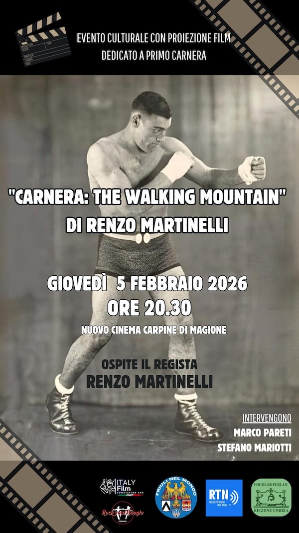 Giovedì 5 febbraio alle 20.30 torna in sala, scegliendo il Cinema "Nuovo Carpine" di Magione, il celebre regista Renzo Martinelli per un evento culturale ad ingresso libero con la successiva proiezione dedicato all’intramontabile pugile Primo Carnera. L’incontro è organizzato dall’Associazione culturale friulana in Umbria “Fogolàr Furlàn”, in collaborazione con RTN Web Radio-Tv, per riportare sul grande schermo la pellicola “Carnera - The walking mountain”, uscita nel 2008 a distanza di sette anni da uno dei film che lo ha reso piu' celebre, quello dedicato al disastro del Vajont (“Vajont – La Diga del Disonore”).