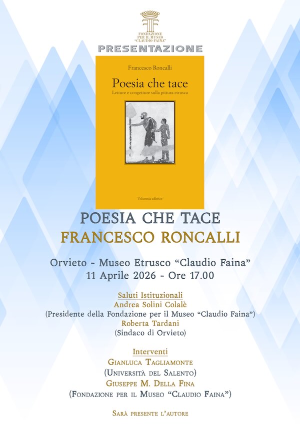 Sabato 11 aprile, alle 17, al Museo Etrusco "Claudio Faina", verrà presentato il volume "Poesia che tace. Letture e congetture sulla pittura etrusca" (Volumnia editrice), l’opera più recente di Francesco Roncalli, uno dei maggiori etruscologi italiani. Il titolo dell’opera trae ispirazione da un aforisma del poeta greco Simonide di Ceo: «la pittura è poesia che tace…, la poesia pittura che parla». Il libro invita il lettore a un viaggio affascinante tra i resti della produzione pittorica dell’antica Etruria: le sue realizzazioni, i suoi colori, i suoi simboli e quindi a comprenderne i messaggi più profondi.