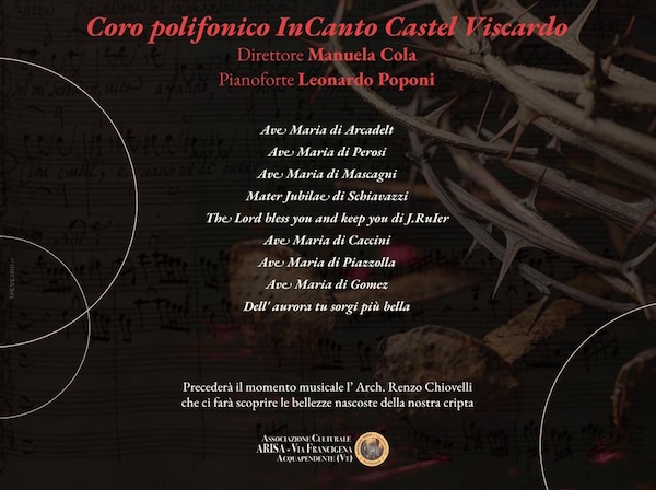 A seguire, il Coro Polifonico "InCanto" di Castel Viscardo prenderà la scena per un concerto interamente dedicato alla figura di Maria e alla benedizione divina. Sotto la sapiente direzione del Maestro Manuela Cola e accompagnato al pianoforte da Leonardo Poponi, il coro eseguirà un programma di rara intensità. In omaggio alla Vergine Maria, il repertorio di 'Ave Maris Stella' spazia dalla tradizione antica alla sensibilità contemporanea. Il concerto si pone come ideale preludio alle celebrazioni di Mezzo Maggio per la Madonna del Fiore, l'atteso evento che celebra la storia di Acquapendente attraverso la secolare tradizione dei Pugnaloni.