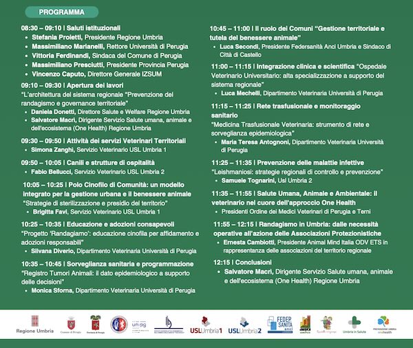 Giovedì 30 aprile, dalle 8.30 alle 12.30, alla Sala dei Notari di Perugia si terrà il convegno regionale "Sistema Umbria per la salute e il benessere degli animali". Apriranno i lavori i saluti della presidente della Regione Umbria Stefania Proietti, del rettore dell’Università di Perugia Massimiliano Marianelli, del presidente della Provincia di Perugia Massimiliano Presciutti, della sindaca di Perugia Vittoria Ferdinandi e del direttore generale dell’IZSUM Vincenzo Caputo. L’apertura tecnica dei lavori sarà affidata a Daniela Donetti, direttrice regionale Salute e Welfare, e a Salvatore Macrì, dirigente del servizio Salute Umana, Animale e dell'Ecosistema (One Health) della Regione Umbria, che illustreranno l’architettura del sistema regionale di prevenzione del randagismo e governance territoriale.