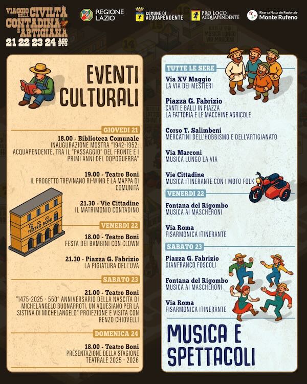Il programma propone numerosi allestimenti a tema e coinvolgenti momenti di socialità popolare come la veglia nell’aia, il corteo contadino e artigiano e il suggestivo matrimonio contadino, che fanno rivivere scene e atmosfere tipiche della civiltà agricola del passato. Non mancheranno momenti di festa con musica dal vivo, balli in piazza e iniziative per tutte le età. In occasione dell’evento sono aperti al pubblico anche i musei cittadini, offrendo un’ulteriore occasione per scoprire la storia, l'arte e l’identità culturale del territorio. Questo e molto altro ancora nel ricco programma del Viaggio nella Civiltà Contadina e Artigiana 2025, promosso dal Comune di Acquapendente in collaborazione con le associazioni e le realtà locali.
