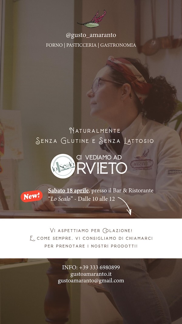 Negli ultimi anni è aumentato il numero delle intolleranze alimentari e anche dei soggetti che ne soffrono. Molto se ne sta parlando sui giornali, in tv e attraverso i social, ma è ancora troppo poco. È importante quindi cogliere appuntamenti come quello del Forno Amaranto che dall’inizio del 2026 sta facendo conoscere, e apprezzare, i prodotti che escono dal proprio laboratorio grazie a un calendario che prevede incontri in città dell’alta Tuscia e dell’Orvietano. Prima di sabato, contattando la titolare Marina, si possono anche prenotare alcuni prodotti e ritirarli il giorno dell’evento. I contatti sono sulla locandina: