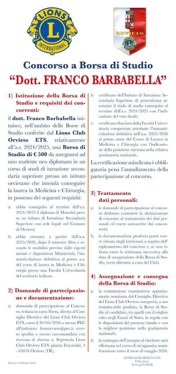 Nell’ambito delle borse di studio conferite dal Lions Club Orvieto Ets, il dottor Franco Barbabella – già primario del Pronto Soccorso dell'Ospedale "Santa Maria della Stella" di Orvieto e past president del sodalizio cittadino fondato 66 anni fa – istituisce, relativamente all’Anno Scolastico 2024/2025, una borsa di studio di 500 euro da assegnarsi ad uno studente neo-diplomato presso un istituto orvietano che intenda conseguite la laurea in Medicina e Chirurgia.